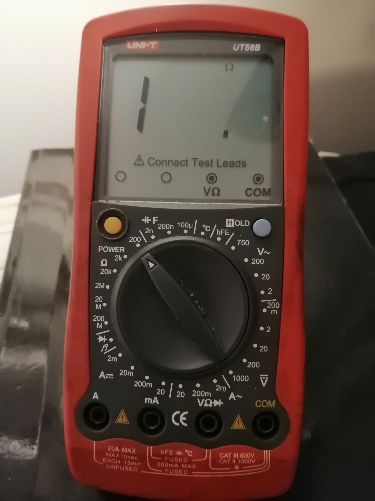 -Mittajohdot. Taas ollaan johdojen kanssa solmussa. No mustan voi kytkeä COM-liittimeen. Punainen. johto... No se on sama kuin resistanssi mittauksessa ja sieltä löytyykin ohmi merkinnän vierestä V-merkintä eli Voltit eli jännitemittaus. (elä huoli, värillä ei ole väliä jos se tuntuu vaikealta kunhan oikea reikä löytyy)